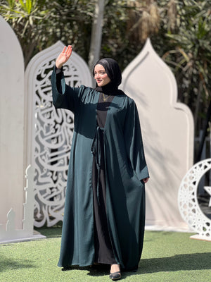 عباية فخمة من حرير مستورد معاها بيزك أسود ناعم من خامة رويال الوا … مزيج عملي وبسيط، وفي نفس الوقت أنيق يخليكِ جاهزة لأي مناسبة.